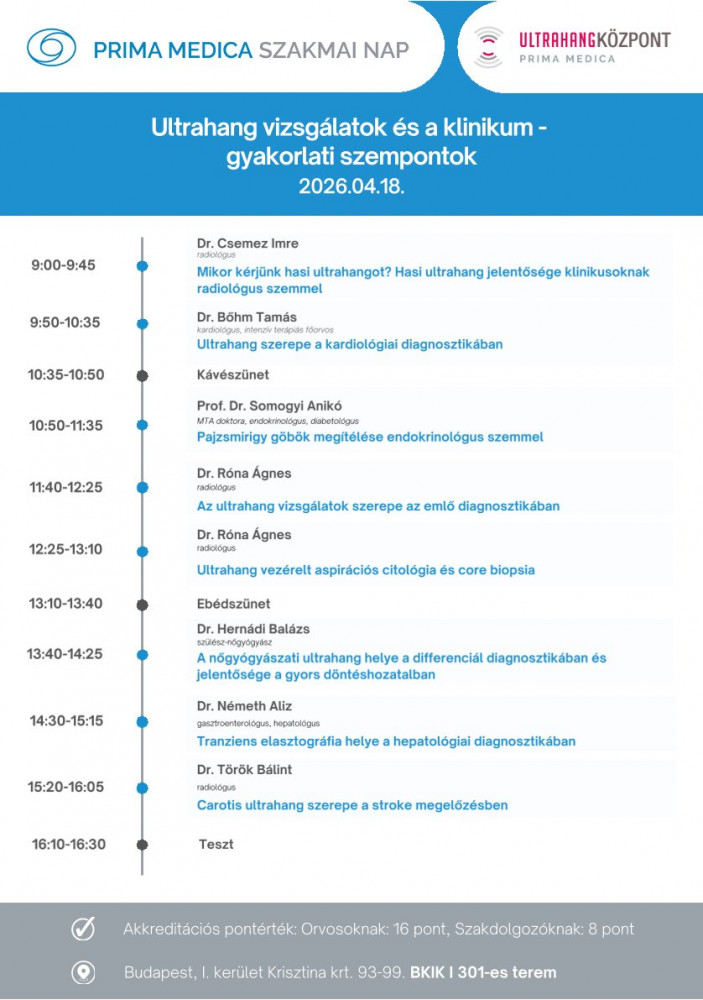2026. április 18-án kerül sor Szakmai Napunkra, „Ultrahangvizsgálatok és a klinikum – gyakorlati szempontok” címmel. Az eseményen az Ultrahangközpont - Prima Medica tapasztalt szakorvosai és a hazai egészségügyi szakma meghatározó szakemberei mutatják be az ultrahangképalkotás legújabb fejlődési irányait és azok klinikai alkalmazhatóságát.